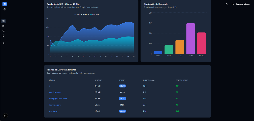 Centraliza todas tus fuentes de datos. Conecta GSC, Analytics, y CRMs en un solo dashboard unificado.