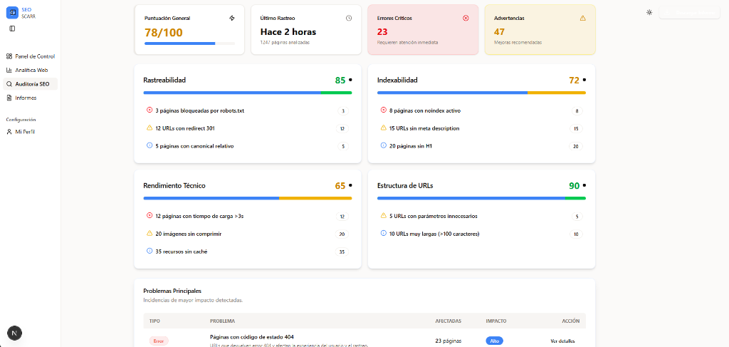 El cliente ve tu logo, tus colores y tu dominio. Toda la potencia de Seoscarr bajo tu propia marca.