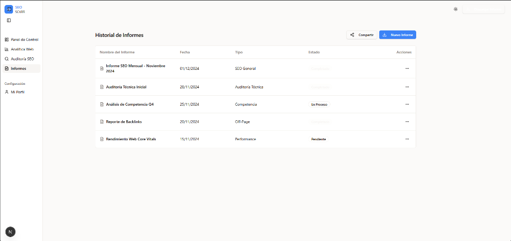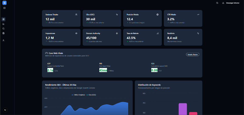 Centraliza SEO, IA y Reporting en una sola interfaz.